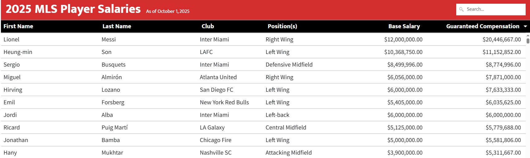 Američka nogometna liga (MLS) svake godine objavljuje visine plaća svojih igrača, a prema najnovijem izvještaju nekoliko je zvučnih imena koja znatno nadmašuju ostatak igračkog kadra po godišnjoj garantovanoj plaći.
