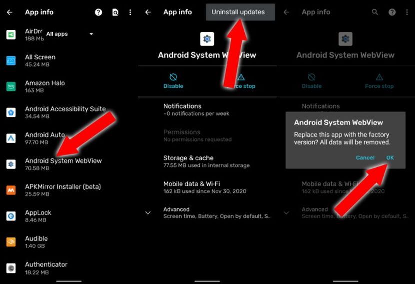 Potrebno je otvoriti glavni Android Settings meni, zatim pritisnuti Apps & Notifications (ili samo "Applications" na nekim telefonima). Zatim pronaći Android System Webview u listi i pritisnite na tu opciju (nije potrebno onemogućiti aplikaciju).