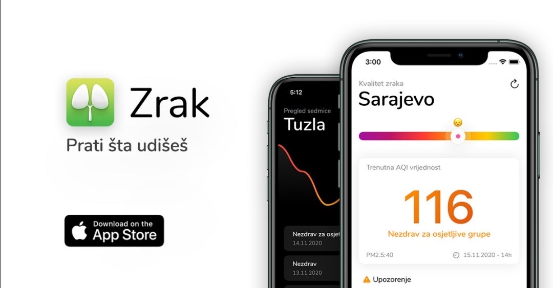 Apsolvent elektrotehničkog fakulteta u Tuzli Tarik Dahić kreirao je aplikaciju pod nazivom ''Zrak'' koja pokazuje vrijednost indeksa zagađenja zraka. Aplikacija je besplatna i jednostavna za korištenje svim građanima, a kako nam kaže Tarik, poseban cilj kojim se vodio prilikom izrade jeste podizanje svijesti kod građana o izuzetno zagađenom i nezdravom zraku kojeg svakodnevno udišemo.