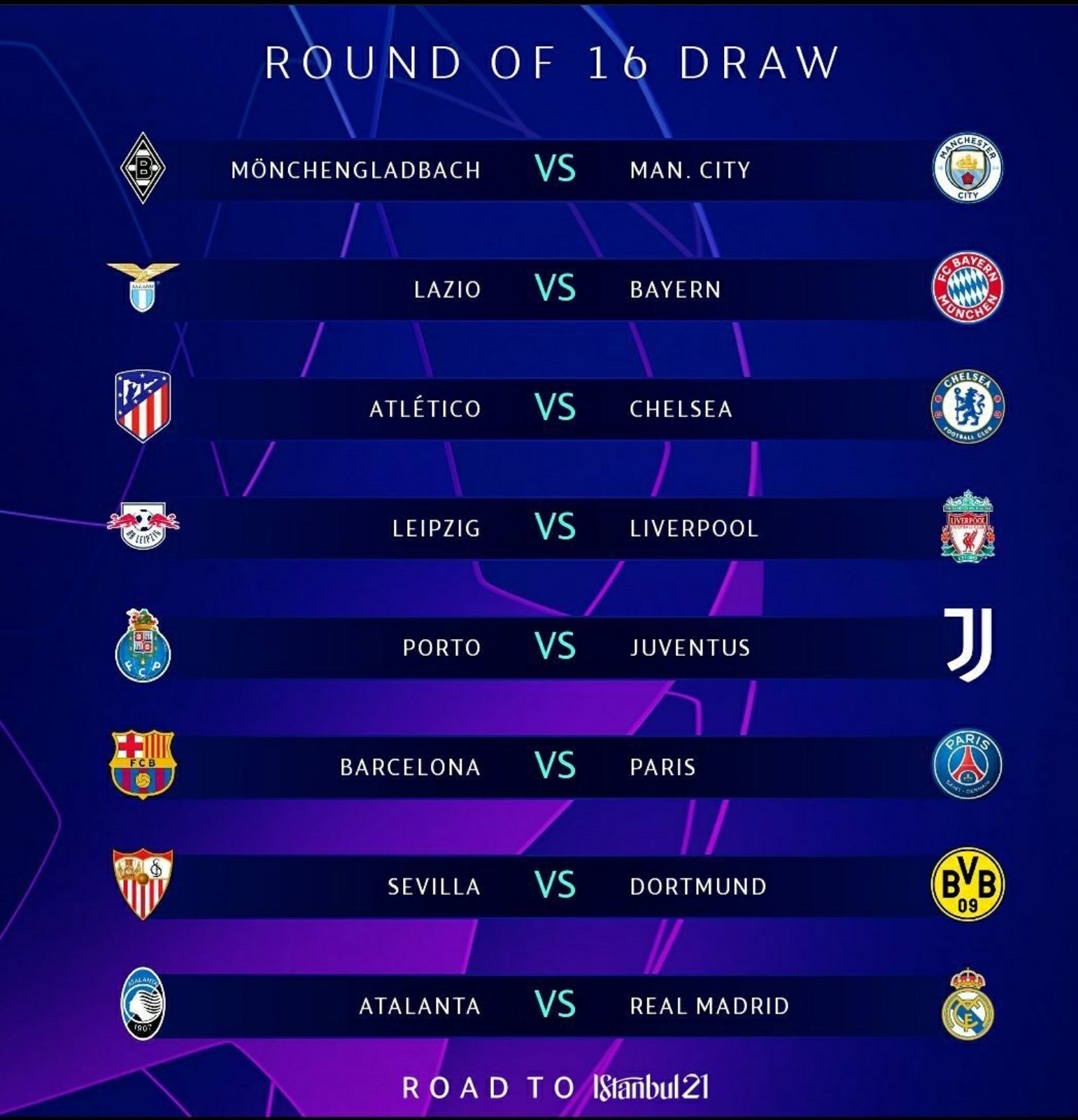 Parovi osmine finala UEFA Lige prvaka: Borussija Monchengladbach - Manchester City, Lazio – Bayern, Atletico Madrid – Chelsea, Leipzig – Liverpool, Porto – Juventus, Barcelona – PSG, Sevilla - Borussija Dortmund i Atalanta - Real Madrid,