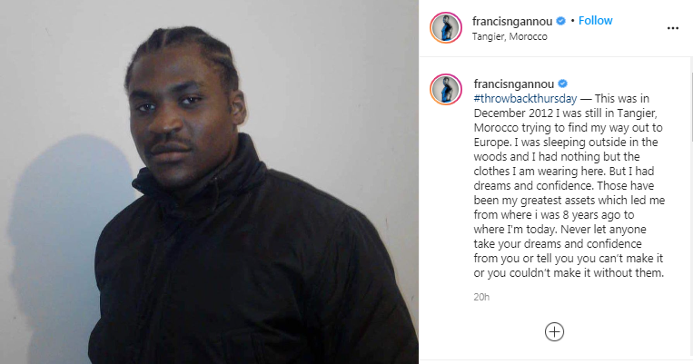 "Bio je ovo decembar 2012. godine. Nalazio sam se u Tangeru (Maroko) i pokušavao pronaći svoj put do Europe. Spavao sam vani u šumi i nisam imao ništa osim odjeće koju nosim na ovoj fotografiji. Međutim, imao sam snove i samopouzdanje, a to me dovelo od mjesta gdje sam bio prije osam godina, do mjesta gdje sam danas. Nikada nemojte dozvoliti da vam netko oduzme vaše snove i samopouzdanje ili vam kaže da ne možete ili nećete uspjeti bez njih", napisao je Ngannou koji je u dosadašnjoj karijeri upisao 15 pobjeda i samo tri poraza.