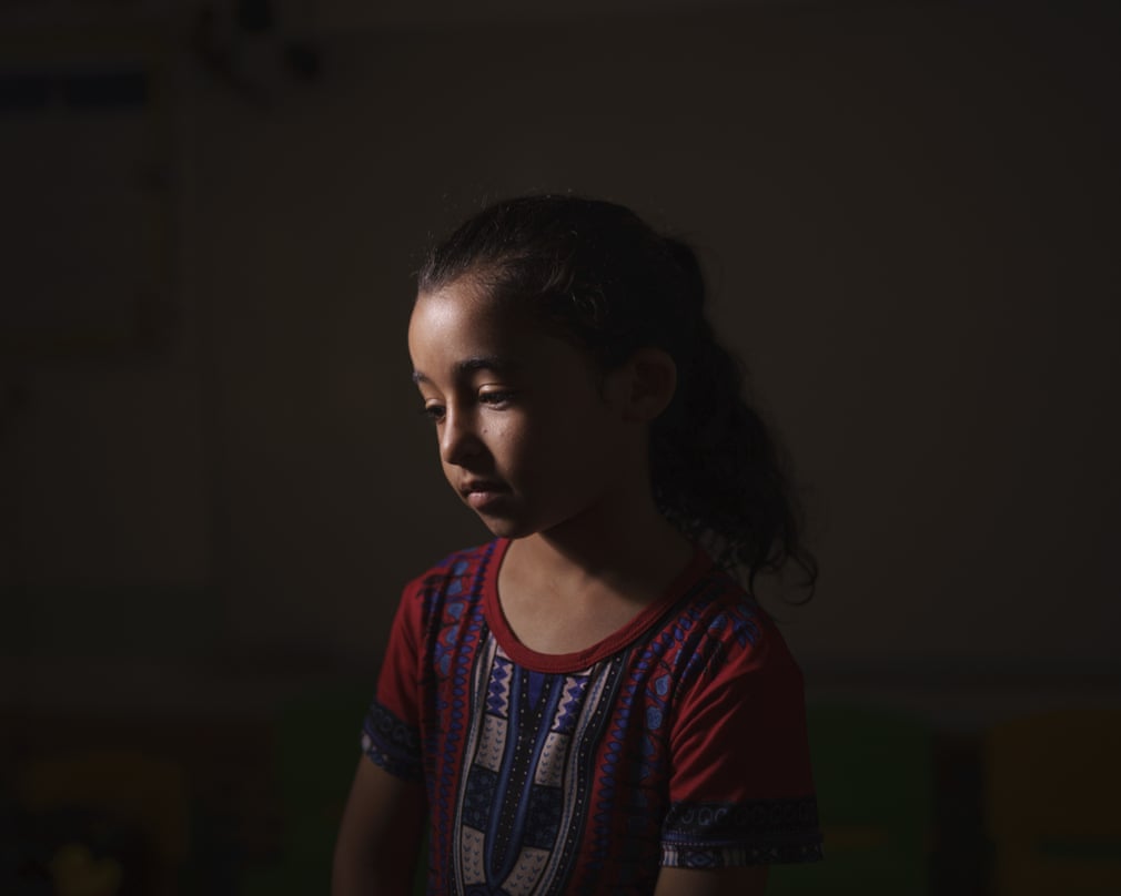 Maya Abu Muawad, osmogodišnjakinja, u školi koju vode UN, u koju se s porodicom skolnila nakon što je njihov dom uništen tokom 11-dnevnog rata u sjevernom pojasu Gaze