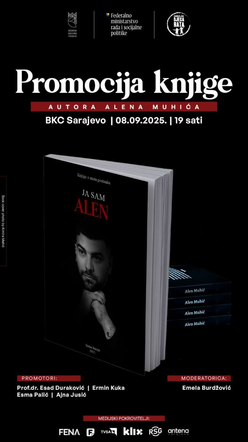 U Bosanskom kulturnom centru KS, večeras 08. 09. 2025, s početkom u 19:00 sati, biće promovirana knjiga “Ja sam Alen", autora Alena Muhića – aktiviste za ljudska prava i člana Udruženja “Zaboravljena djeca rata”.